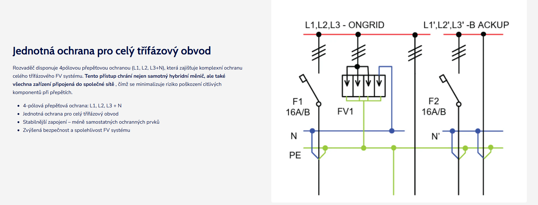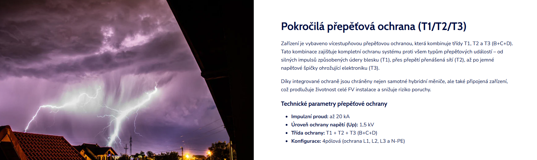 - Přepěťová ochrana: 4 zařízení, kombinovaná třída T1+T2+T3 (B+C+D)