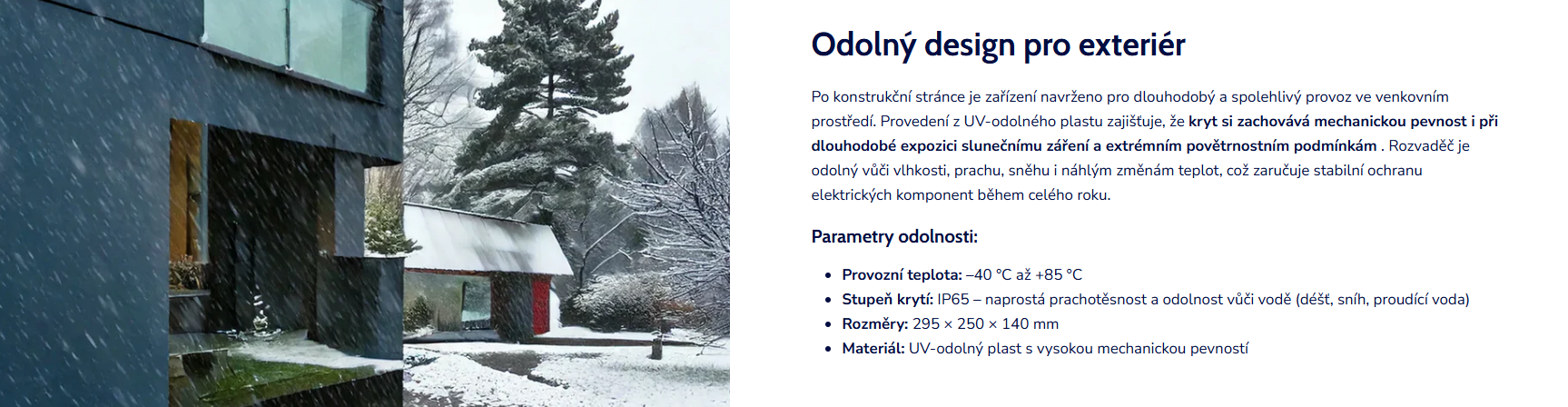 Skříňka je vyrobena z UV-odolného plastu s krytím IP65, vhodná pro dlouhodobý venkovní provoz. Zařízení je dimenzováno na teploty od -40 °C do +85 °C a má rozměry 295 × 250 × 140 mm, což umožňuje kompaktní montáž.