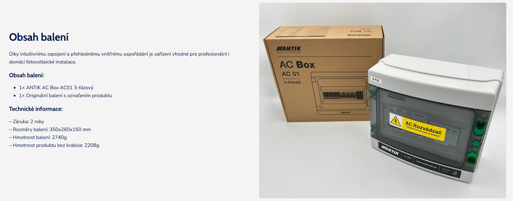 ANTIK AC Box AC01 3-fázový je 3-fázový AC rozvaděč určený pro on-grid i off-grid fotovoltaické systémy. Propojuje měnič se sítí a záložním okruhem a díky integrovaným prvkům zajišťuje stabilní a bezpečný provoz celé instalace.
