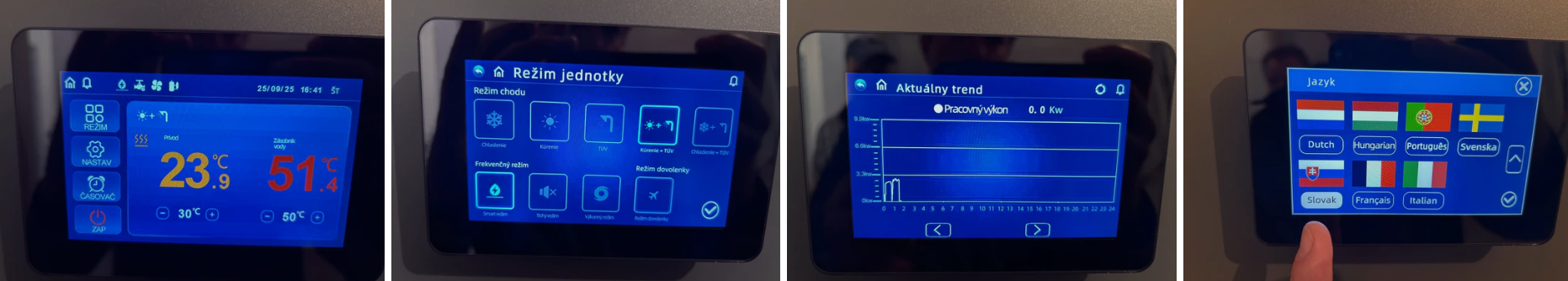 - Režimy provozu – vytápění, chlazení, TUV, kombinované režimy i speciální „režim dovolené“.