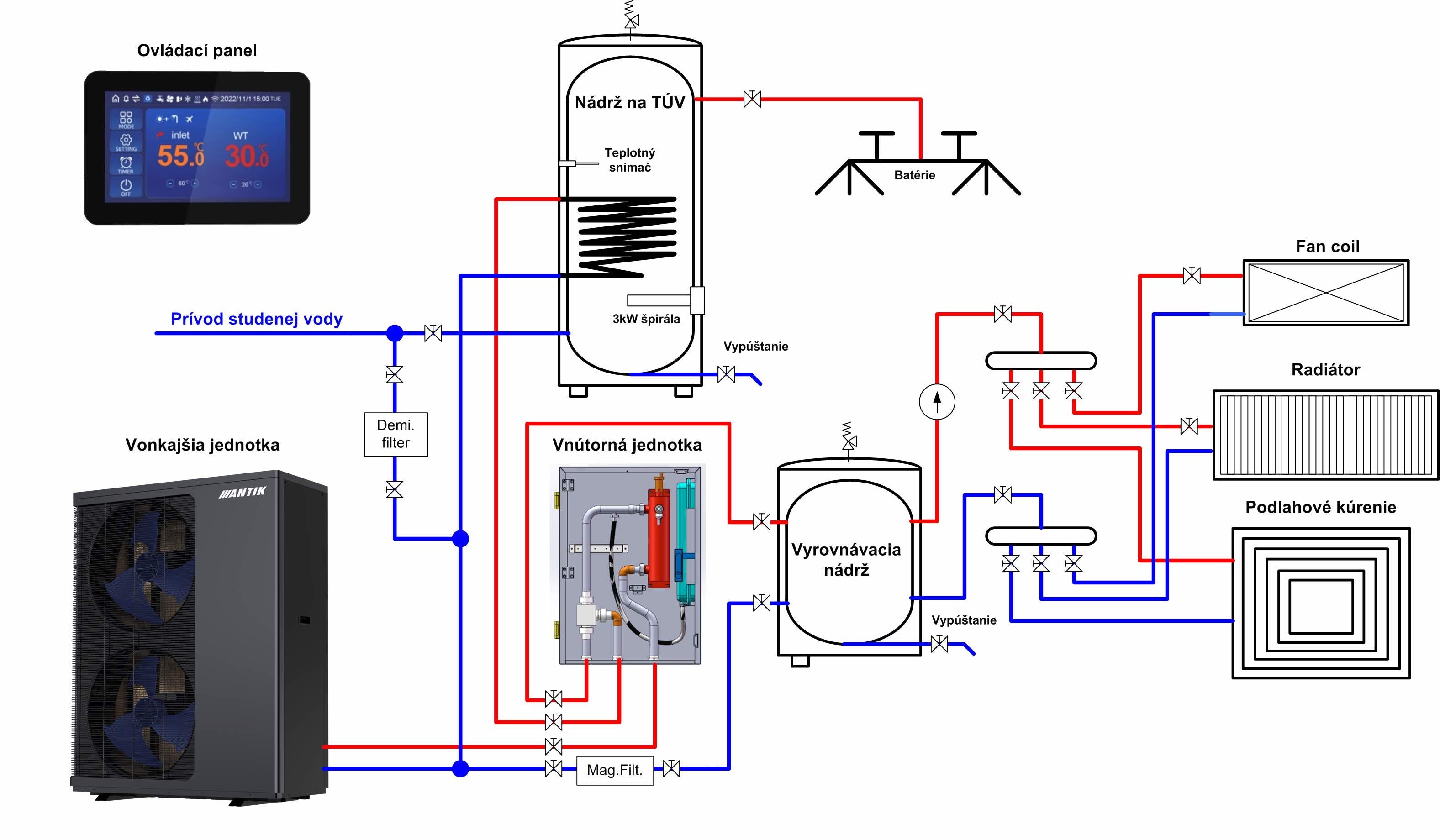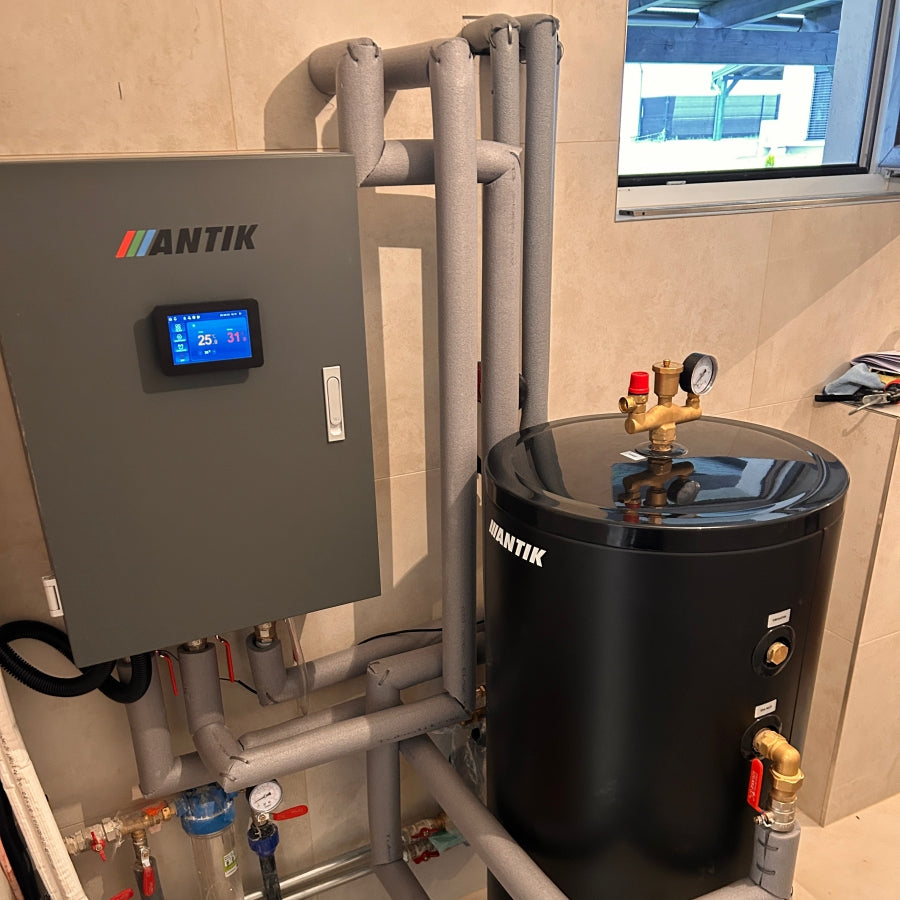 Kompletní systém tepelného čerpadla ANTIK typu monoblok 8 kW s ekologickým chladivem R290 je doplněn o hydraulický rozvaděč s řídící elektronikou a akumulační zásobník teplé vody . Dotykový displej umožňuje detailní nastavení a monitoring provozu, zatímco kvalitně izolované rozvody snižují tepelné ztráty. Zásobník zajišťuje stabilní průtok a optimální hospodaření s energií při vytápění i ohřevu vody.