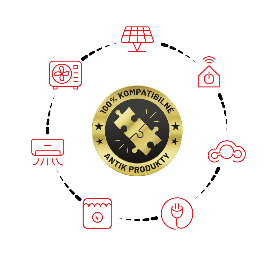 Všechny technologie od ANTIKU jsou vyvinuty tak, aby spolu bez problémů spolupracovaly. Prostřednictvím platformy ANTIK Cloud se fotovoltaika, tepelná čerpadla, klimatizace, ohřev vody, SmartHome i nabíjení elektromobilu propojují do jednoho inteligentního systému. Ten řídí spotřebu energie, zvyšuje efektivitu domácnosti a umožňuje pohodlné ovládání z jedné aplikace ANTIK SmartHome.