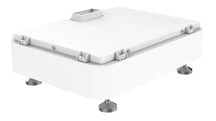 Pod ním jsou tři bateriové moduly s LFP články uloženy v rámových kazetách; na jejich čelech jsou servisní/krycí prvky a svislé vodící lišty zabezpečují mechanickou fixaci celé sestavy na podstavě s antivibračními nožičkami.