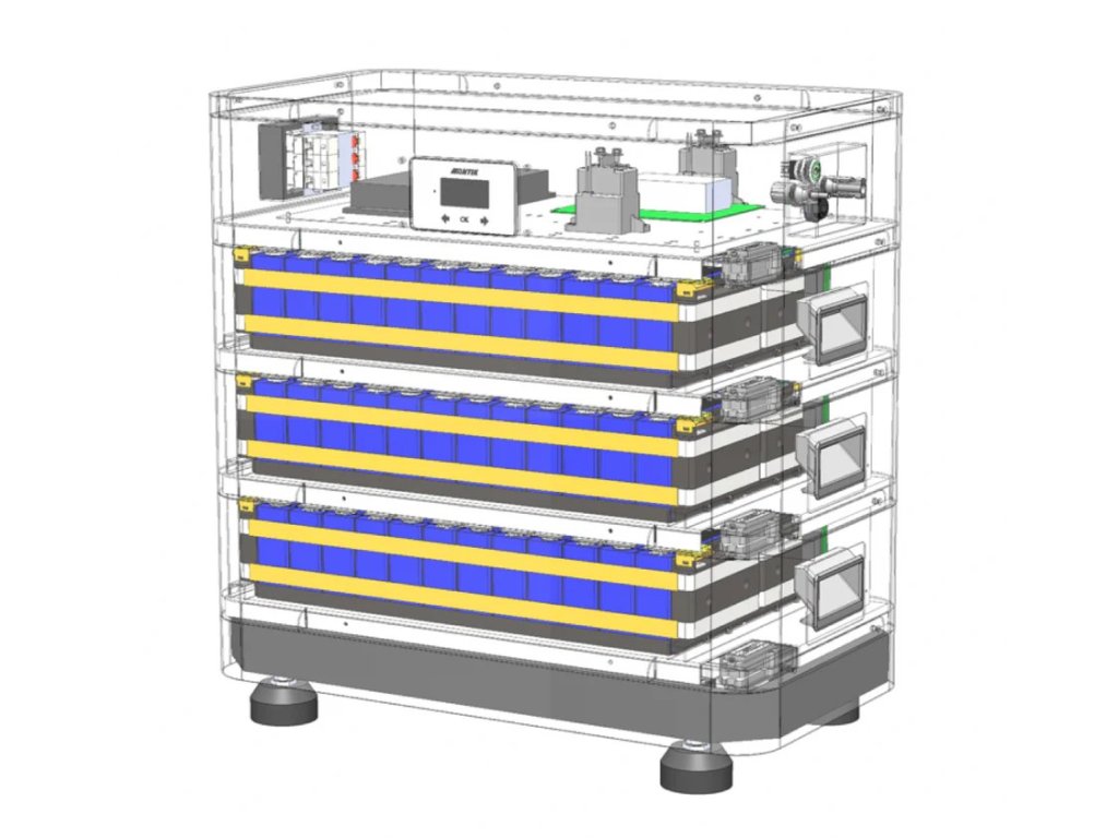 Pod ním jsou tři bateriové moduly s LFP články uloženy v rámových kazetách; na jejich čelech jsou servisní/krycí prvky a svislé vodící lišty zabezpečují mechanickou fixaci celé sestavy na podstavě s antivibračními nožičkami.