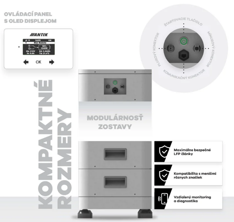 Přední OLED panel se dotykovými tlačítky a LED indikací napájení poskytuje přehled o stavu nabití, tocích energie a okamžitém výkonu. Baterie komunikuje přes domácí Wi-Fi s ANTIK Cloudem , což umožňuje vzdálený monitoring a diagnostiku až na úroveň článků . Na bočnici jsou RJ45 komunikační port a startovací tlačítko s podsvícením.