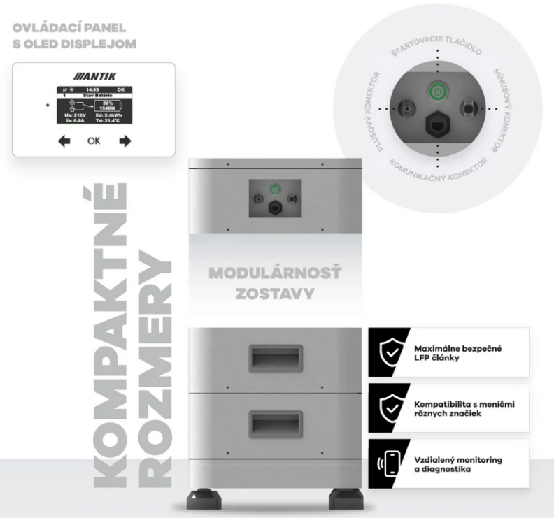 Přední OLED panel se dotykovými tlačítky a LED indikací napájení poskytuje přehled o stavu nabití, tocích energie a okamžitém výkonu. Baterie komunikuje přes domácí Wi-Fi s ANTIK Cloudem , což umožňuje vzdálený monitoring a diagnostiku až na úroveň článků . Na bočnici jsou RJ45 komunikační port a startovací tlačítko s podsvícením.