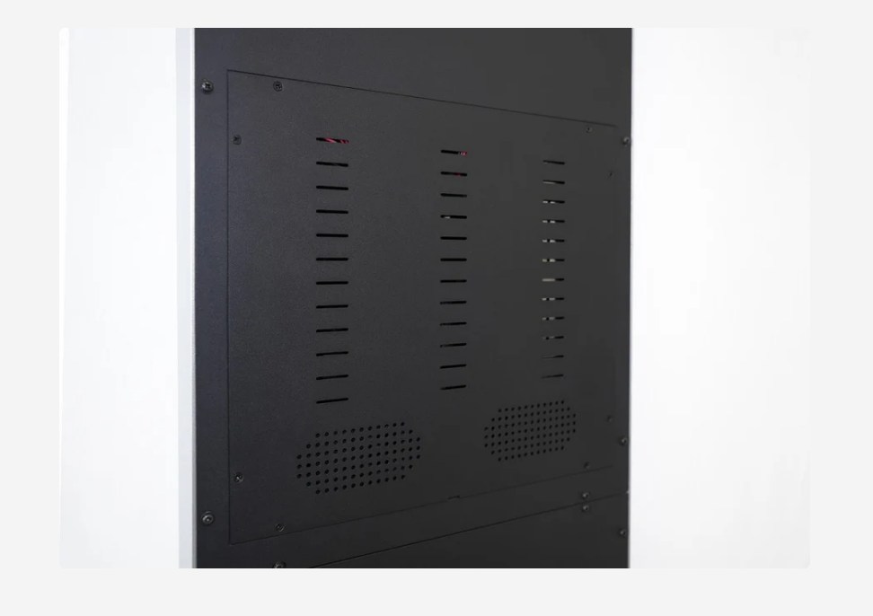 Zadní strana displeje obsahuje přesně umístěné ventilační otvory pro efektivní pasivní chlazení. Tento systém umožňuje přirozené odvádění tepla bez potřeby ventilátorů. Minimalizuje riziko přehřátí a prodlužuje životnost zařízení. Umožňuje tichý provoz i v tichém prostředí jako recepce či galerie. Navrženo pro stabilní výkon při dlouhodobém používání.