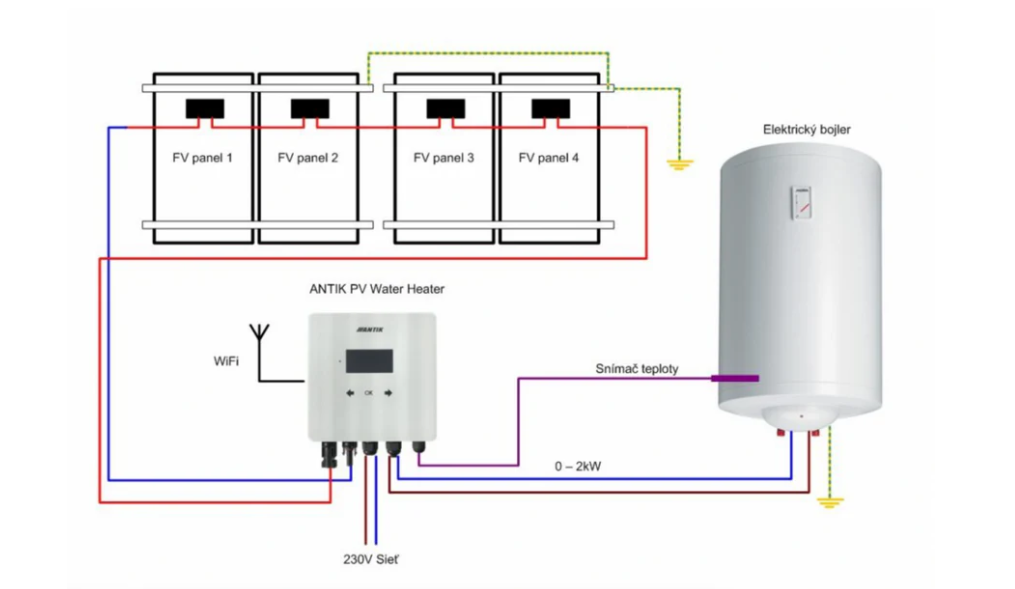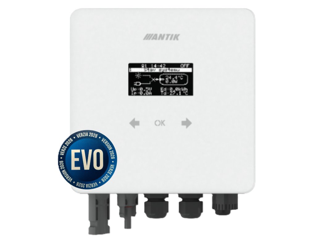Měnič pro ohřívač vody ANTIK Smart DC je navržen pro přímé připojení k stejnosměrnému výstupu fotovoltaických panelů. Nevyžaduje připojení přes síťový měnič ani k hlavnímu rozvaděči domu.