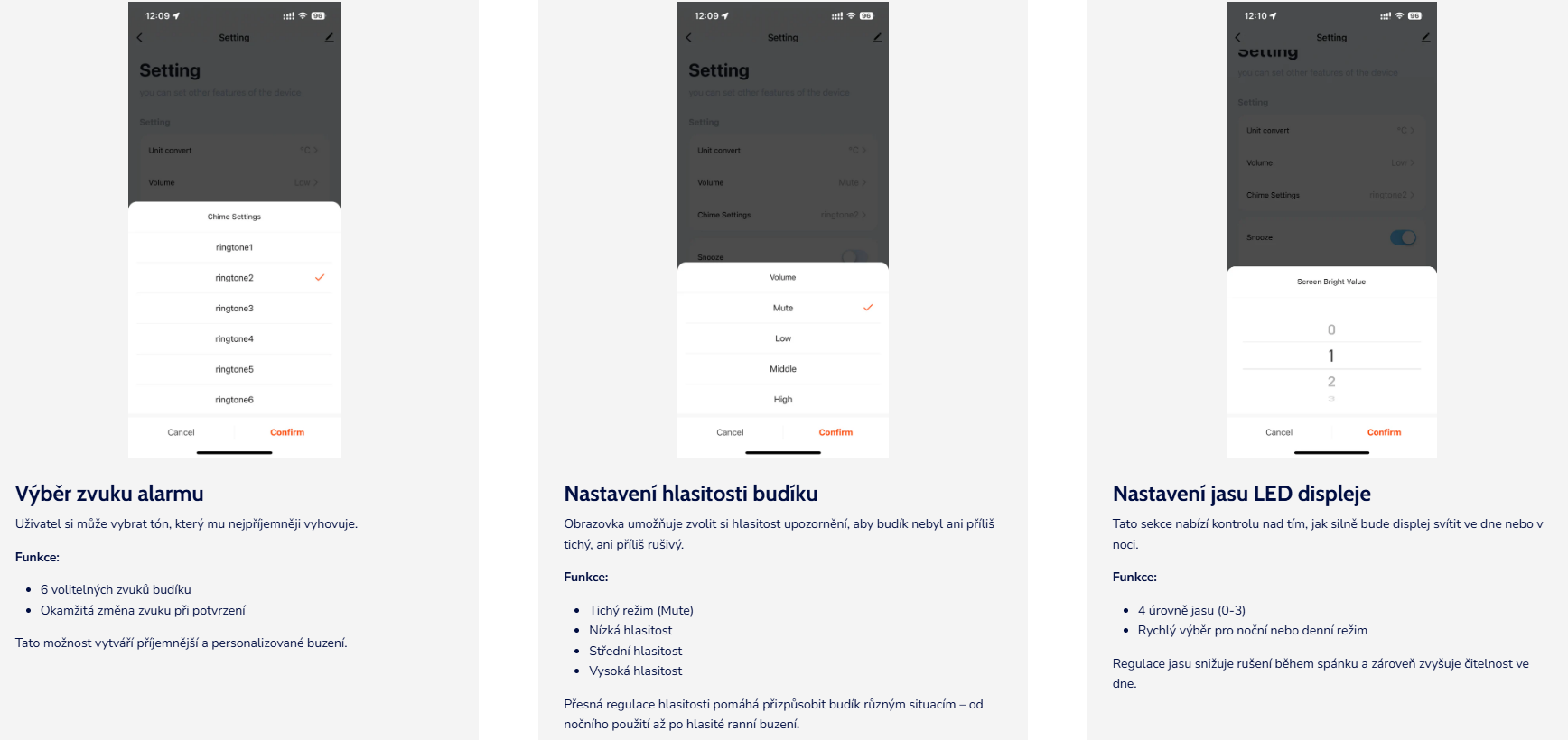 - Nastavení budíku: Výběr tónů, hlasitosti a chování budíku přímo v rozhraní.