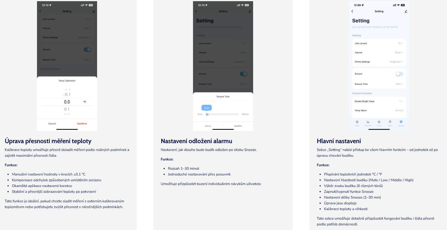 Aplikace nabízí přehledné sledování senzoru v reálném čase a poskytuje všechny důležité údaje na jednom místě. Umožňuje sledovat vývoj teploty a vlhkosti, nastavovat alarmy a přizpůsobit chování zařízení podle potřeb uživatele. Díky automatizacím dokáže senzor spolupracovat s dalšími chytrými zařízeními a vytvářet komfortní prostředí. Nastavení budíku, zvuků i jasu jsou plně přizpůsobitelná.