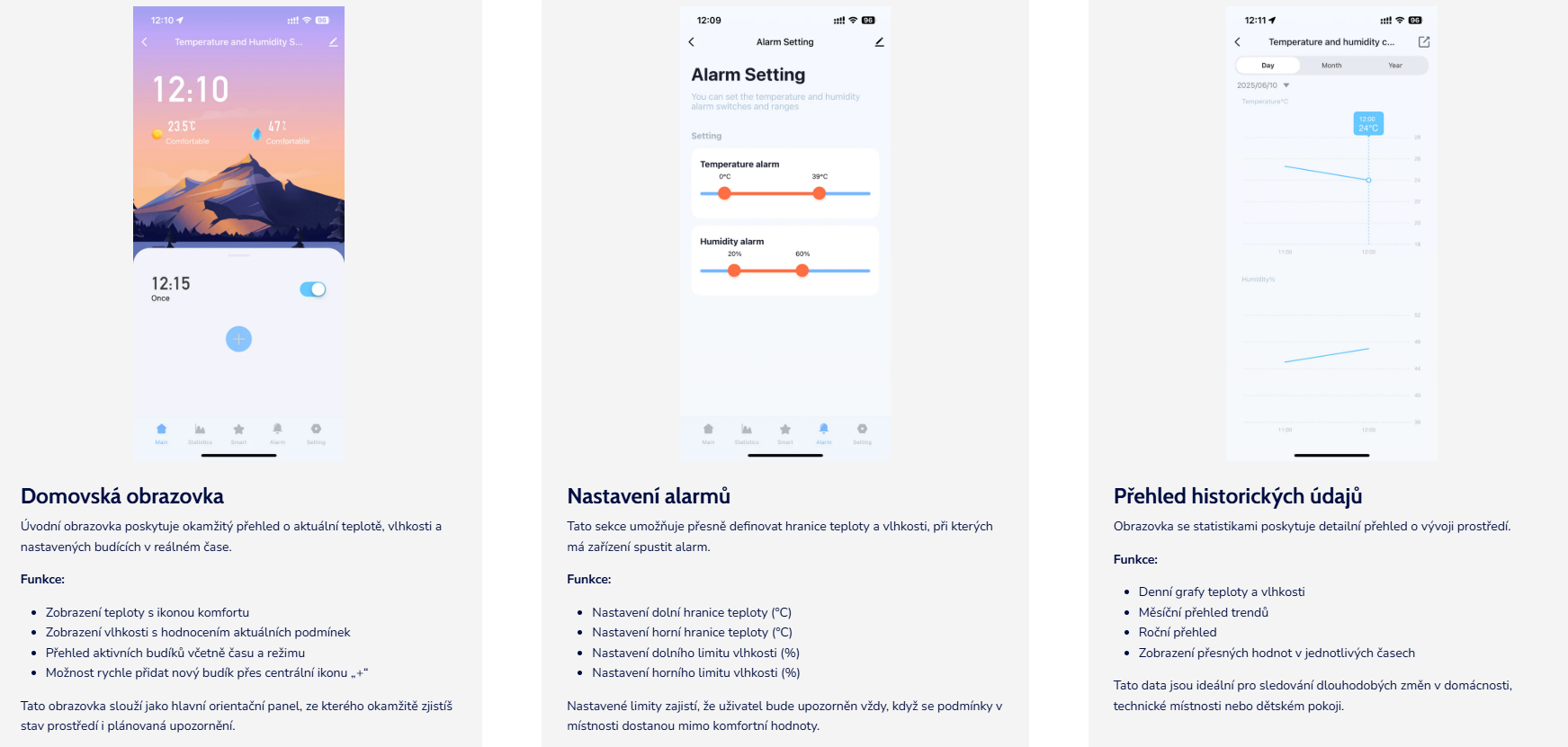 - Upozornění na překročení limitů: Notifikace při překročení nastavené teploty nebo vlhkosti.