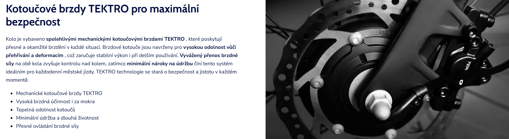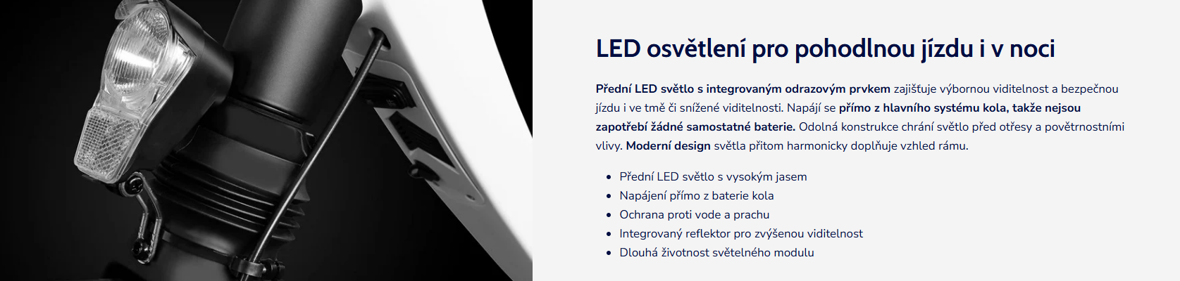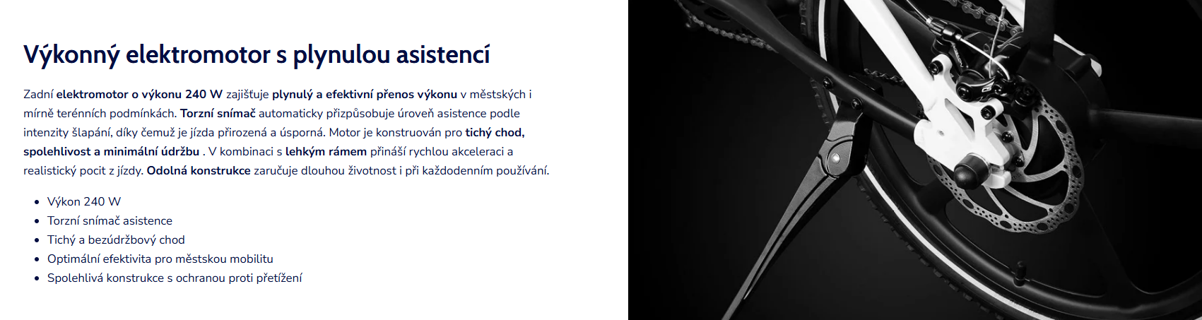 Kolo je vybaveno 240 W bezúdržbovým elektromotorem se třemi stupni výkonu, který poskytuje plynulou a efektivní jízdu v městském prostředí.
