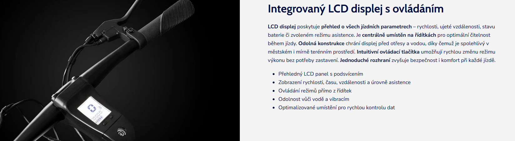 LCD displej informuje o rychlosti, ujeté vzdálenosti, stavu baterie a zvoleném stupni asistence.