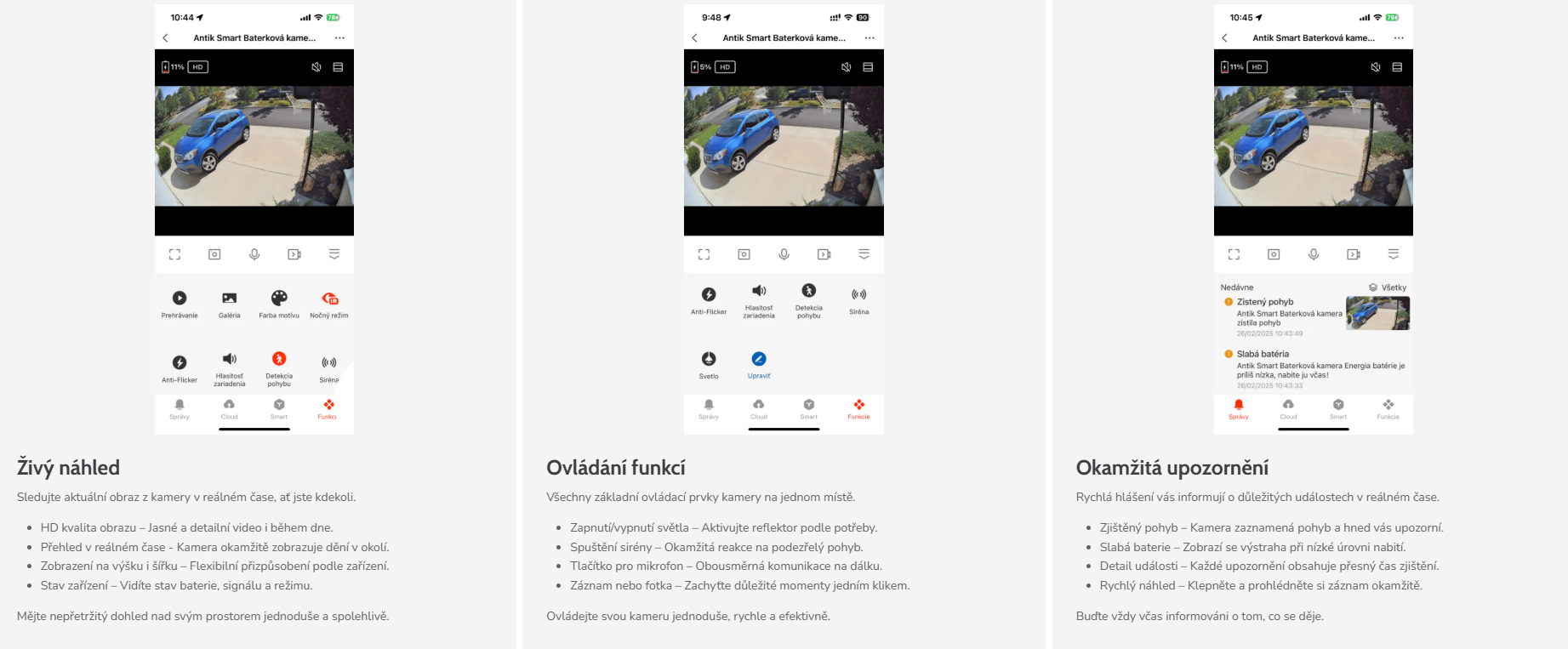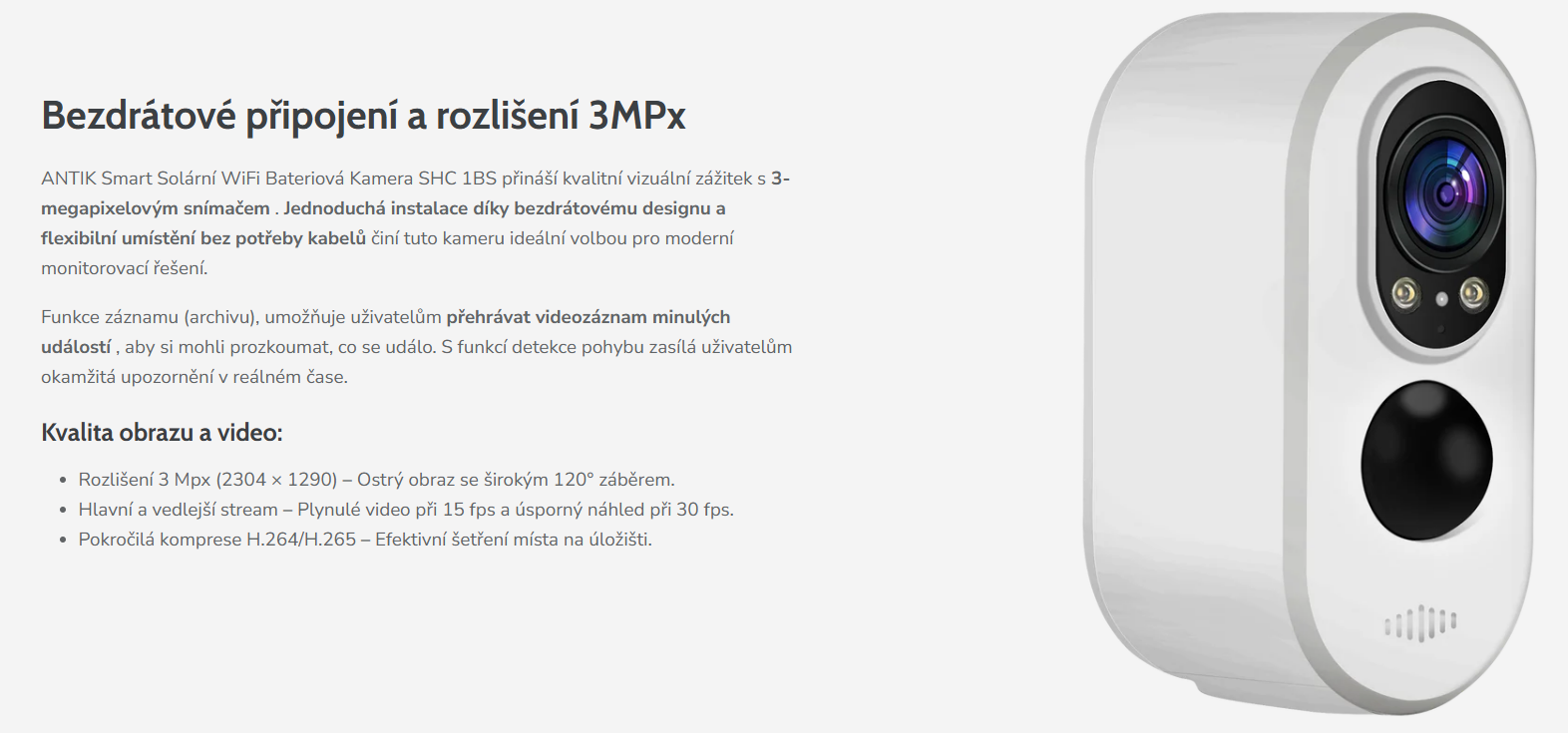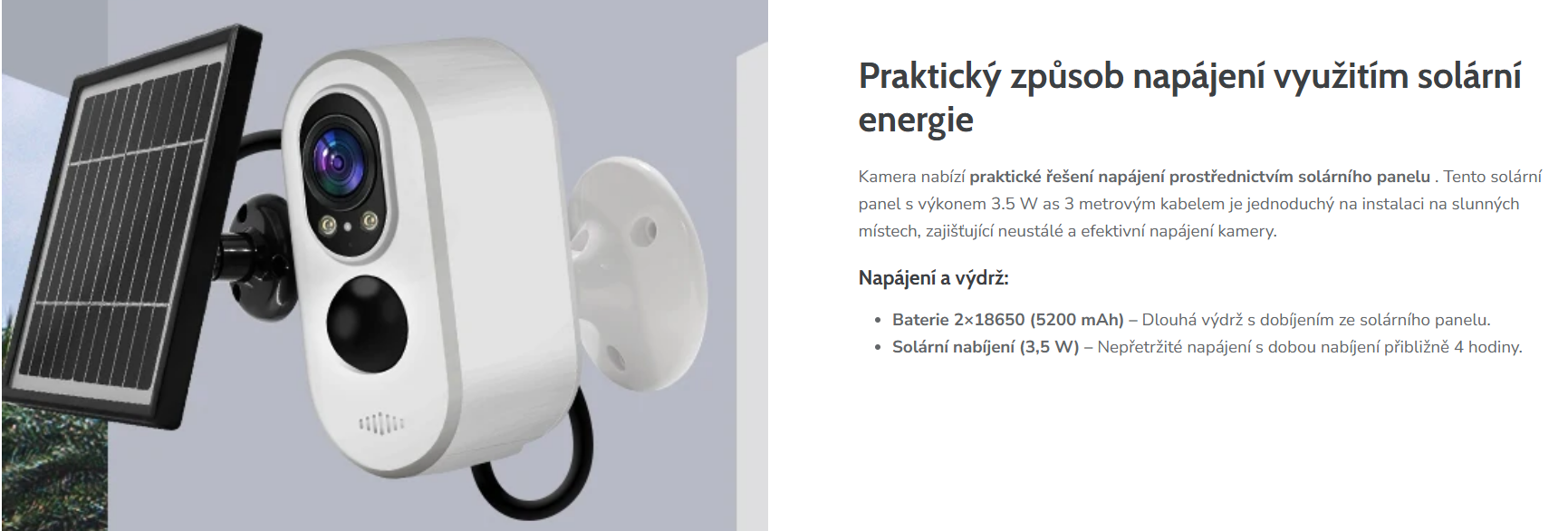 ANTIK Smart Solární WiFi Bateriová Kamera SHC 1BS se napájí prostřednictvím solárního panelu. Solární panel poskytuje nabíjecí výkon 3.5 W a je dodáván spolu s 3 metrovým kabelem, který usnadňuje instalaci zařízení na požadované místo. O dlouhou výdrž kamery se postará integrovaná lithiová baterie typu „18650“ s kapacitou 5200 mAh. Zákazník tak nemá starost s častým dobíjením baterie, což zvyšuje uživatelský komfort kamery.