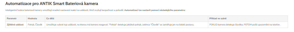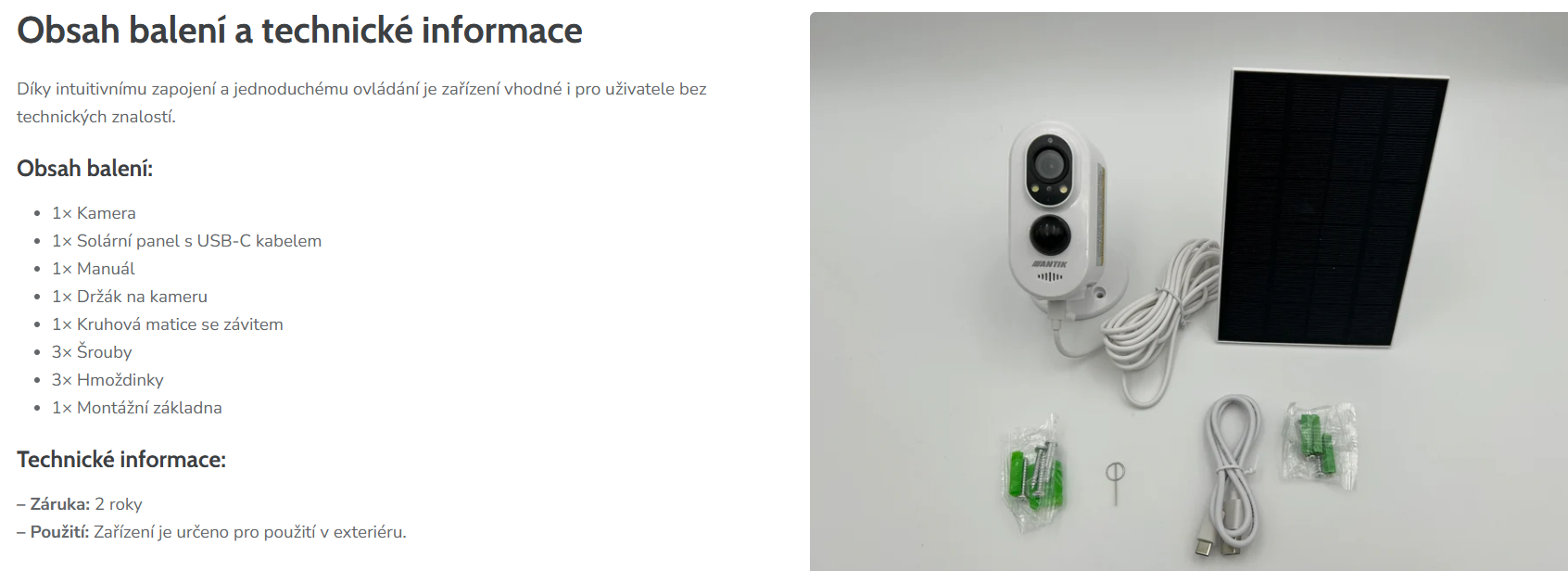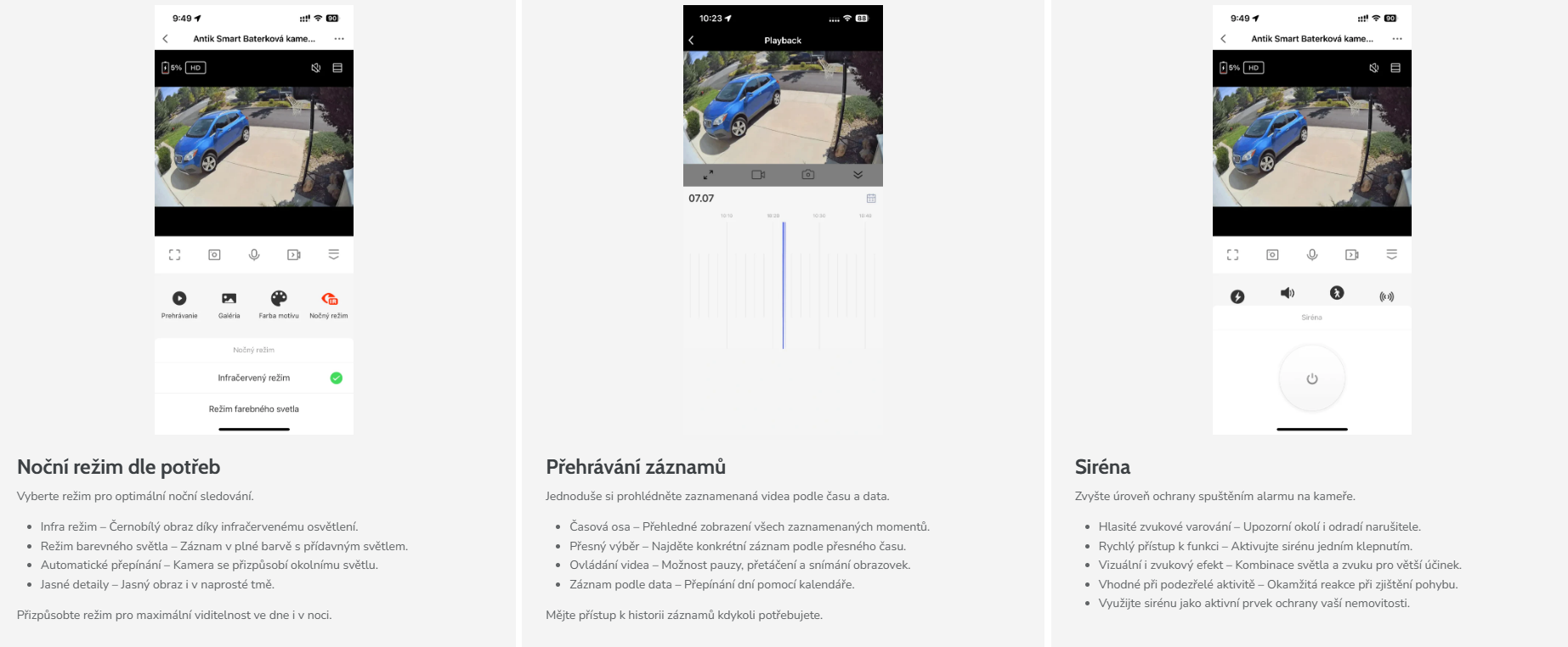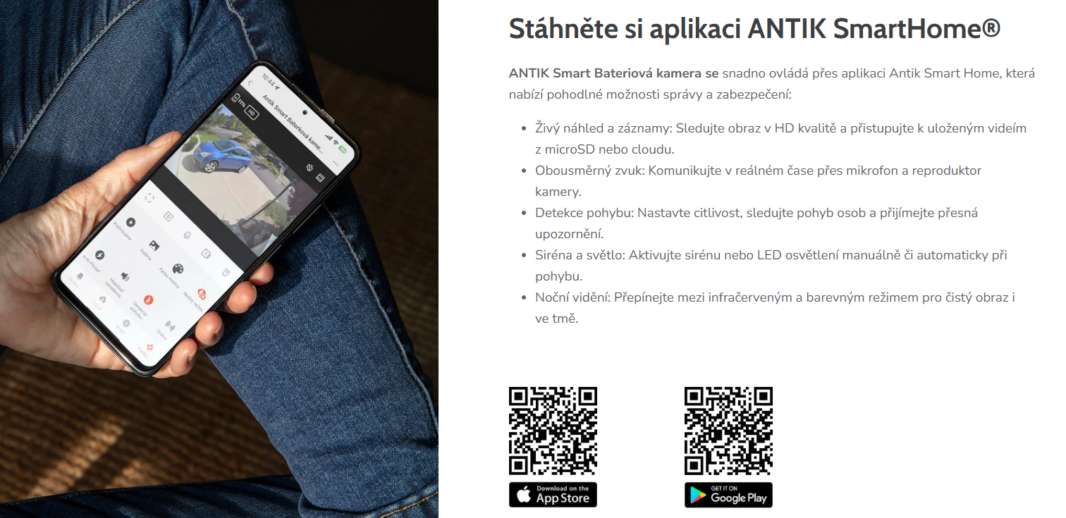 ANTIK Smart Solární WiFi Bateriová Kamera SHC 1BS se napájí prostřednictvím solárního panelu. Solární panel poskytuje nabíjecí výkon 3.5 W a je dodáván spolu s 3 metrovým kabelem, který usnadňuje instalaci zařízení na požadované místo. O dlouhou výdrž kamery se postará integrovaná lithiová baterie typu „18650“ s kapacitou 5200 mAh. Zákazník tak nemá starost s častým dobíjením baterie, což zvyšuje uživatelský komfort kamery.