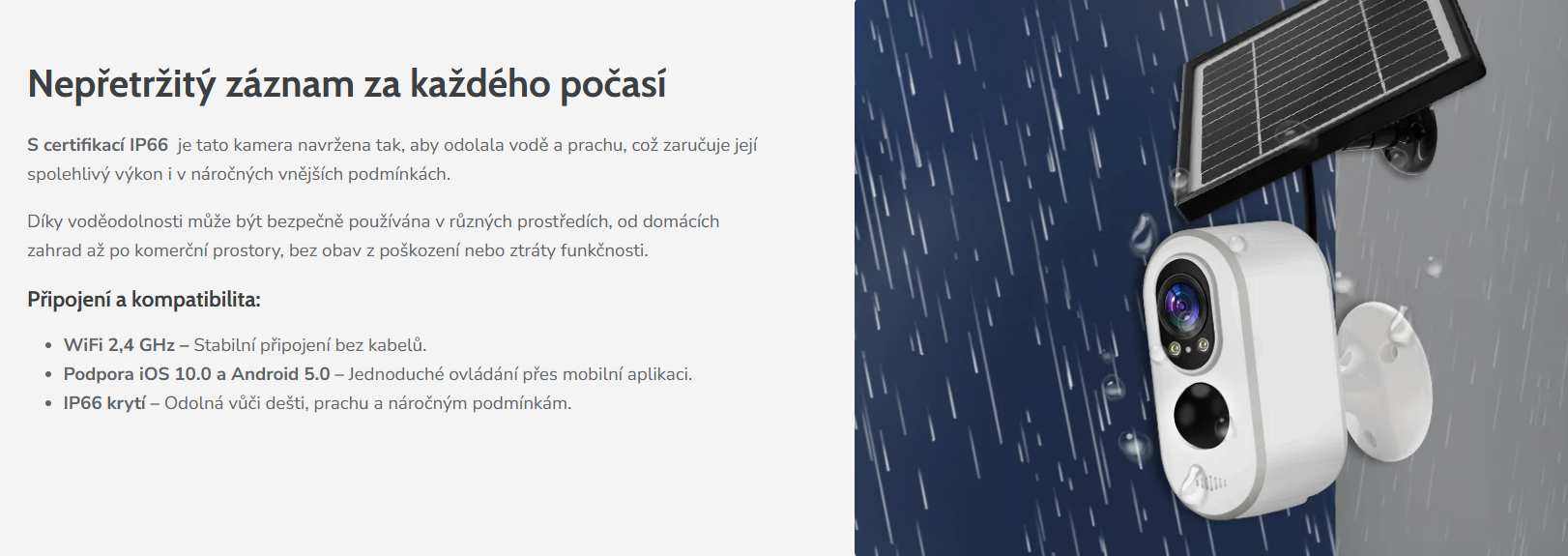 S certifikací IP66 je tato kamera navržena tak, aby odolala vodě a prachu, což zaručuje její spolehlivý výkon i v náročných vnějších podmínkách. Uvedený standard zvyšuje použitelnost zařízení v různých prostředích, od domácích zahrad až po komerční prostory, bez obav z poškození nebo ztráty funkčnosti.