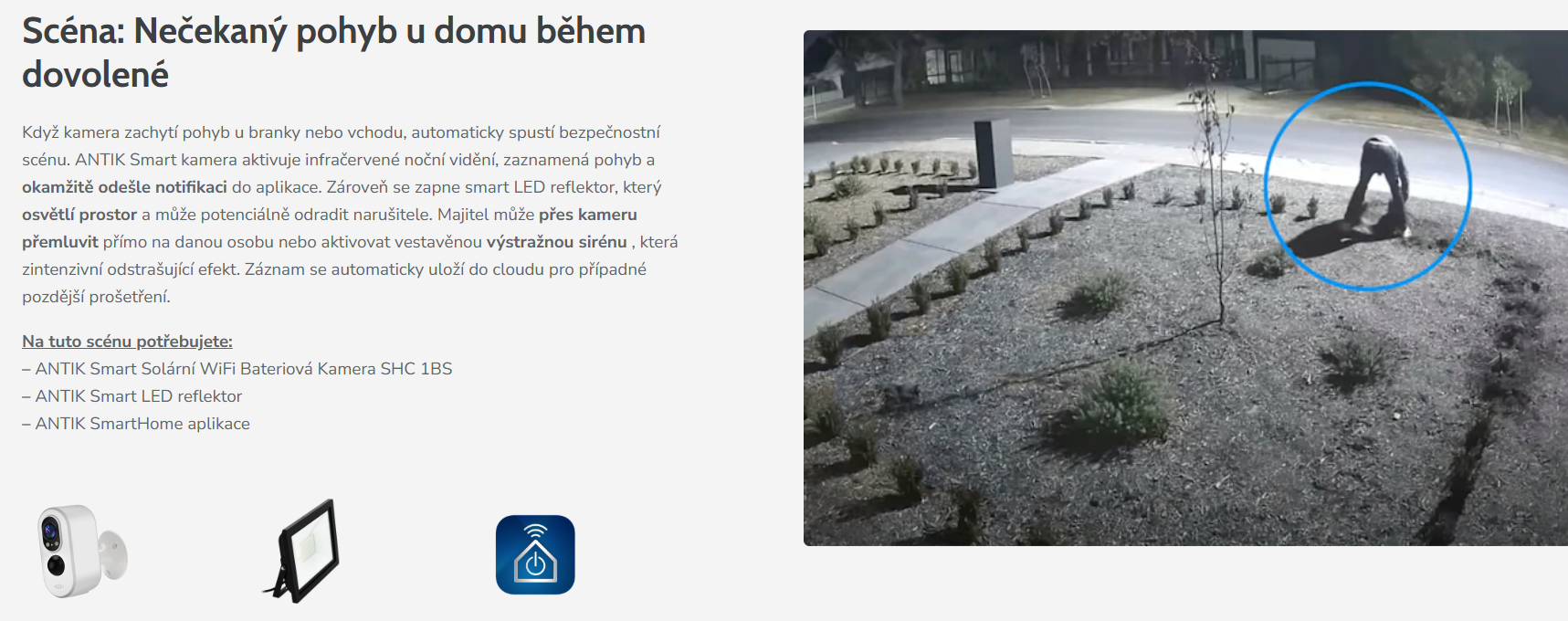ANTIK Smart Solární WiFi Bateriová Kamera ATK-SHC1BS je spolehlivá bezdrátová kamera navržená pro použití v exteriéru. S možností připojení k solárním panelům a vestavěnou baterií poskytuje nepřetržité napájení a dlouhodobou výdrž. Je vybavena snímačem s rozlišením 3 megapixely, nočním viděním a dvousměrným audio systémem. Standardem je podpora kamery v rámci bezplatné aplikace ANTIK SmartHome®.